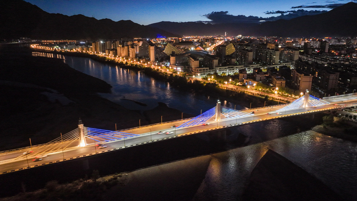 This aerial drone photo taken on July 30, 2025 shows a bridge over the Lhasa River, in Lhasa, Southwest China's Xizang autonomous region. [Photo/Xinhua]