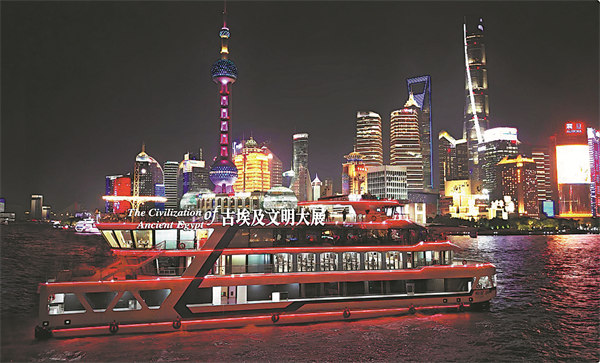 A cruise along the Huangpu River in Shanghai shows an advertisement for the Egypt exhibition. [Photo provided to China Daily]