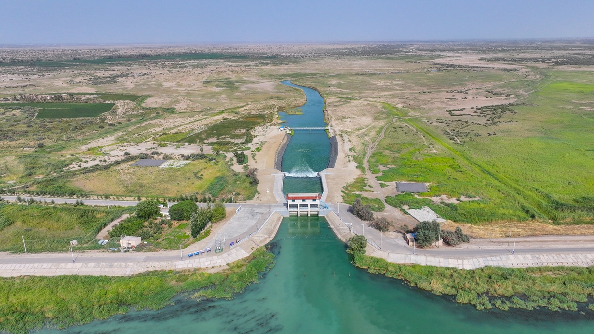 A drone photo taken on Aug 6, 2025 shows water flowing from the Daxihaizi Reservoir into the river course in Yuli county, Northwest China's Xinjiang Uygur autonomous region. [Photo/Xinhua]