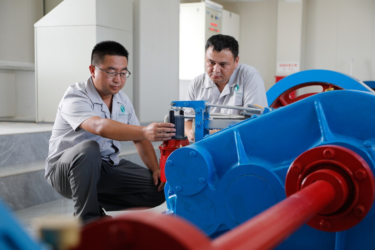 Staff members inspect the brake of a hoist at the discharging gate house of the Daxihaizi Reservoir in Yuli county, Northwest China's Xinjiang Uygur autonomous region, on Aug 6, 2025. [Photo/Xinhua]