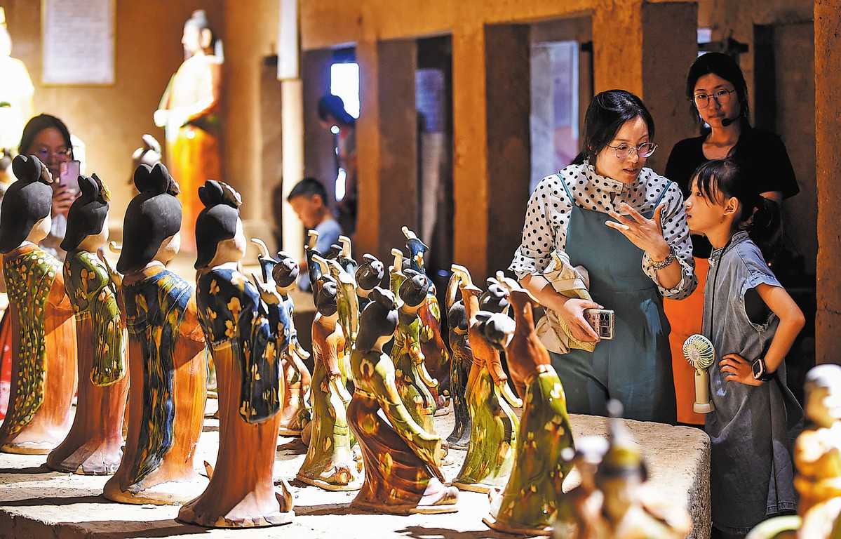 Visitors interact in front of artworks highlighting Tang Dynasty (618-907) glazed ceramics at a cultural park in Luoyang, Henan province, on July 19. HUANG ZHENGWEI/FOR CHINA DAILY