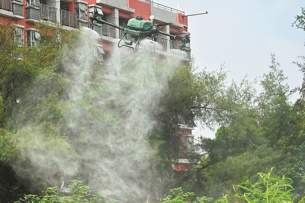 A drone is deployed to exterminate mosquitoes in Liwan district, Guangzhou, Guangdong province, on Aug 1. CHEN CHUHONG/CHINA NEWS SERVICE