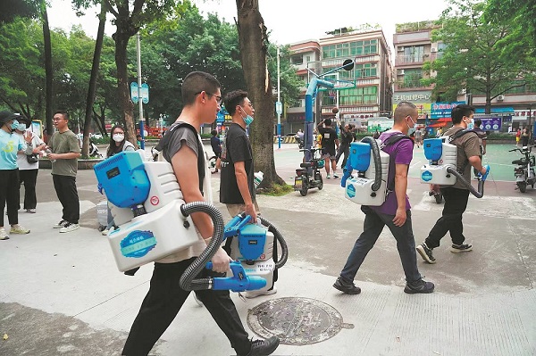 Members of a mosquito eradication team increase sanitation levels in Foshan. WENG HUAN/FOR CHINA DAILY