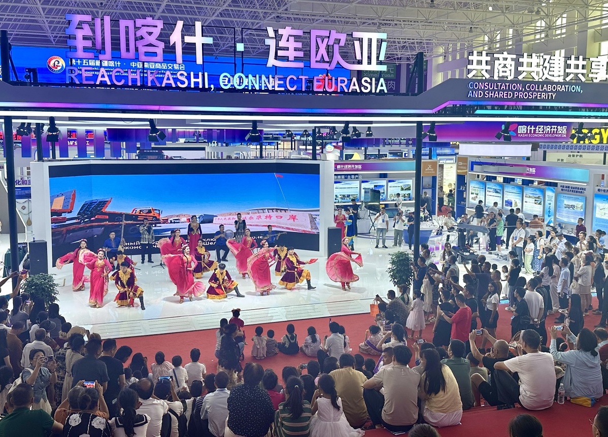 Traditional dancers at the 15th Kashgar-Central and South Asia Commodity Fair, which began on Aug 15, 2025. [Photo by Zhao Ruixue/chinadaily.com.cn]