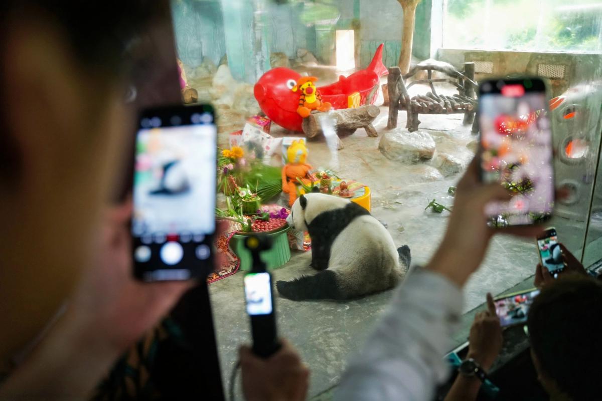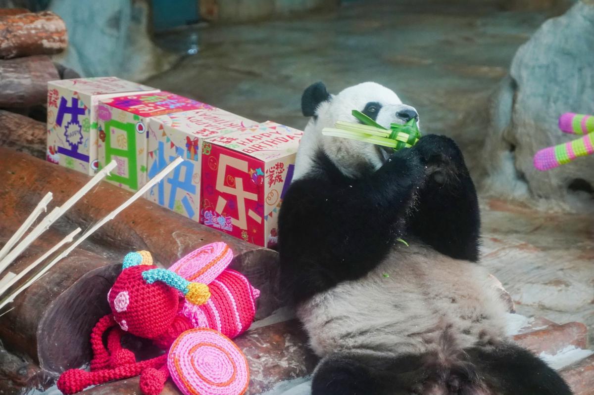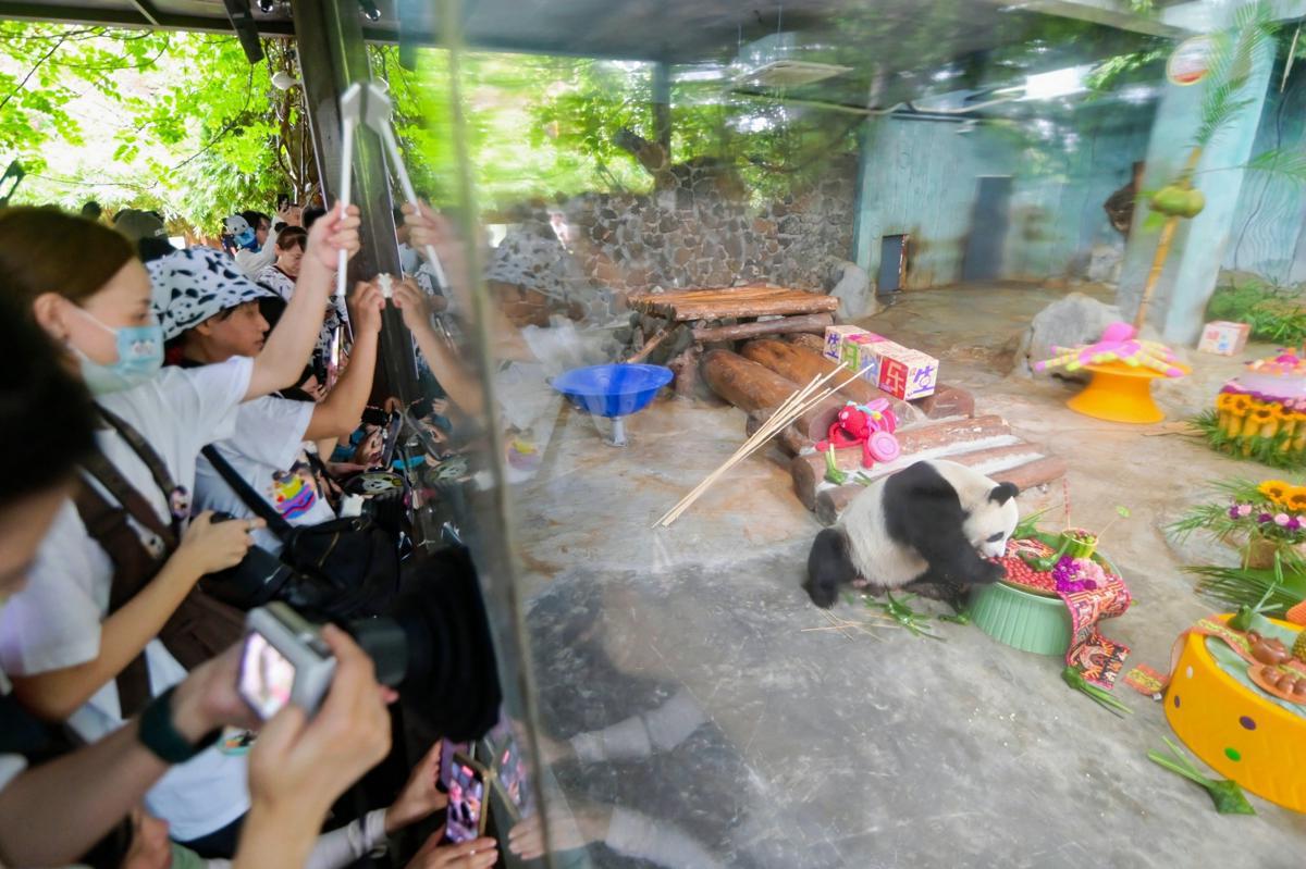 Panda duo Gonggong and Shunshun celebrate their birthday with visitors in Hainan province on Monday. [Photo provided to chinadaily.com.cn]