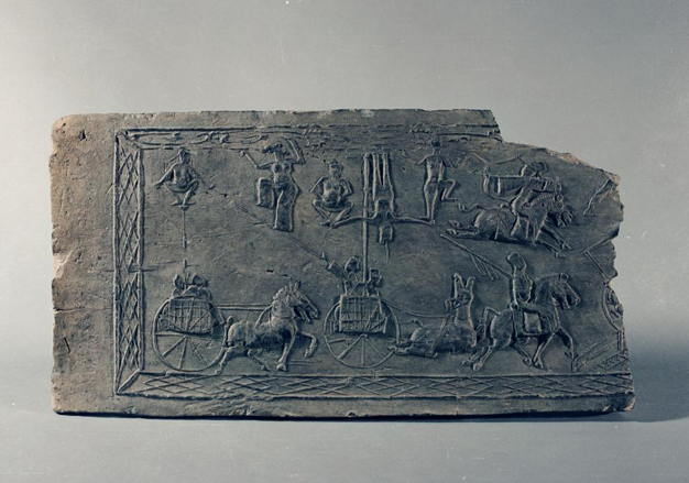 Brick relief captures ancient acrobatic show on moving chariots