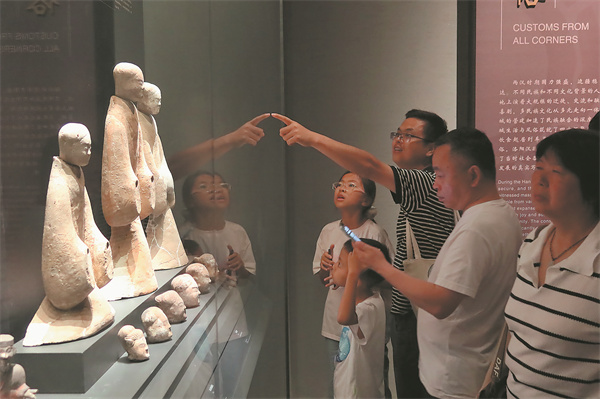 Visitors to the newly opened Han-Wei Luoyang Ancient City Site Museum examine pottery figurines from the Western Han Dynasty (206 BC-AD 24).[Photo provided to China Daily]