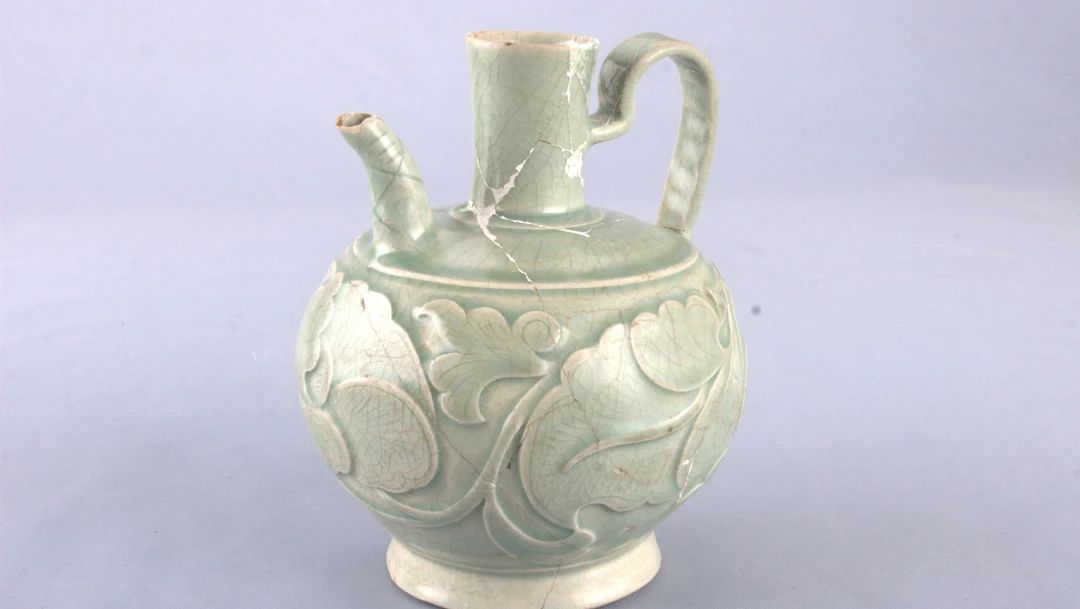 Celadon ewer engraved with peony motifs, Five Dynasties (907-960) [Photo/Anyang Museum official WeChat account]
