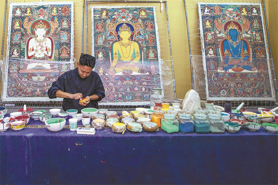 An artist mixes pigments for Tibetan thangka paintings, which has been lauded as an illustrated encyclopedia of Tibetan culture for its unique artistic and cultural value. JIANG FAN/TENZING NIMA QADHUP/XINHUA