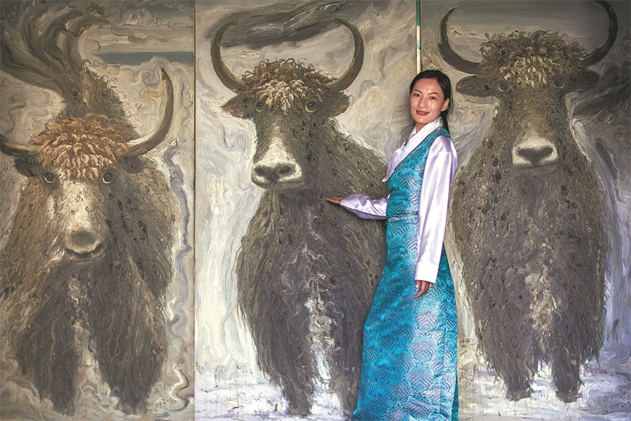 Dressed in traditional Tibetan costume, a woman poses in front of a painting in Lhasa. JIANG FAN/TENZING NIMA QADHUP/XINHUA