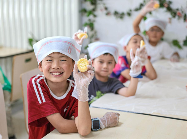 Children at a summer daycare center in Rongcheng, Shandong province, make traditional pastries on Tuesday. [Photo by Li Xinjun/for chinadaily.com.cn]