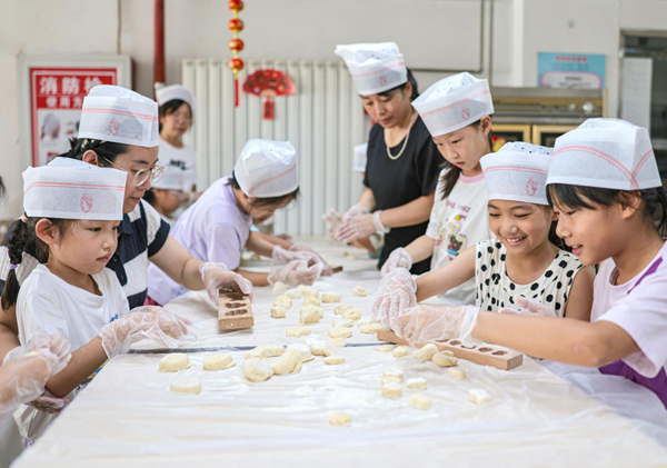 Children at a summer daycare center in Rongcheng, Shandong province, make traditional pastries on Tuesday. [Photo by Li Xinjun/for chinadaily.com.cn]
