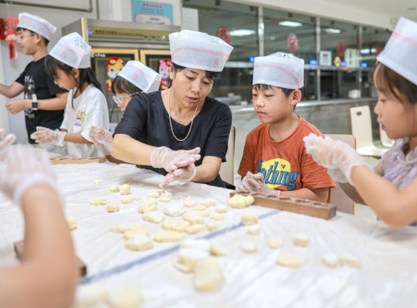 Children at a summer daycare center in Rongcheng, Shandong province, make traditional pastries on Tuesday. [Photo by Li Xinjun/for chinadaily.com.cn]