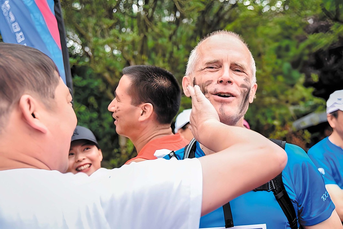 Michael Hermann from Germany gets his face daubed with straw ash during the Hualian Festival in Qiubei county, Yunnan, while participating in a marathon. CHINA DAILY