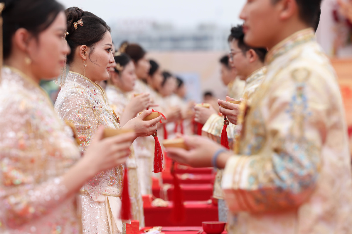 China Railway Taiyuan Group Co Ltd in Taiyuan, Shanxi province, hosts a Chinese-style group wedding on Qixi Festival, widely regarded as China's Valentine's Day, on Aug 29, 2025. [Photo by Zhu Xingxin/chinadaily.com.cn]
