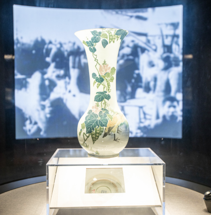 A highlight is the underglaze five-color vase with a trumpet-shaped flared mouth and motifs of sweet peas and a pair of bamboo partridges, which won a gold medal at the 1915 Panama-Pacific International Exposition in San Francisco.