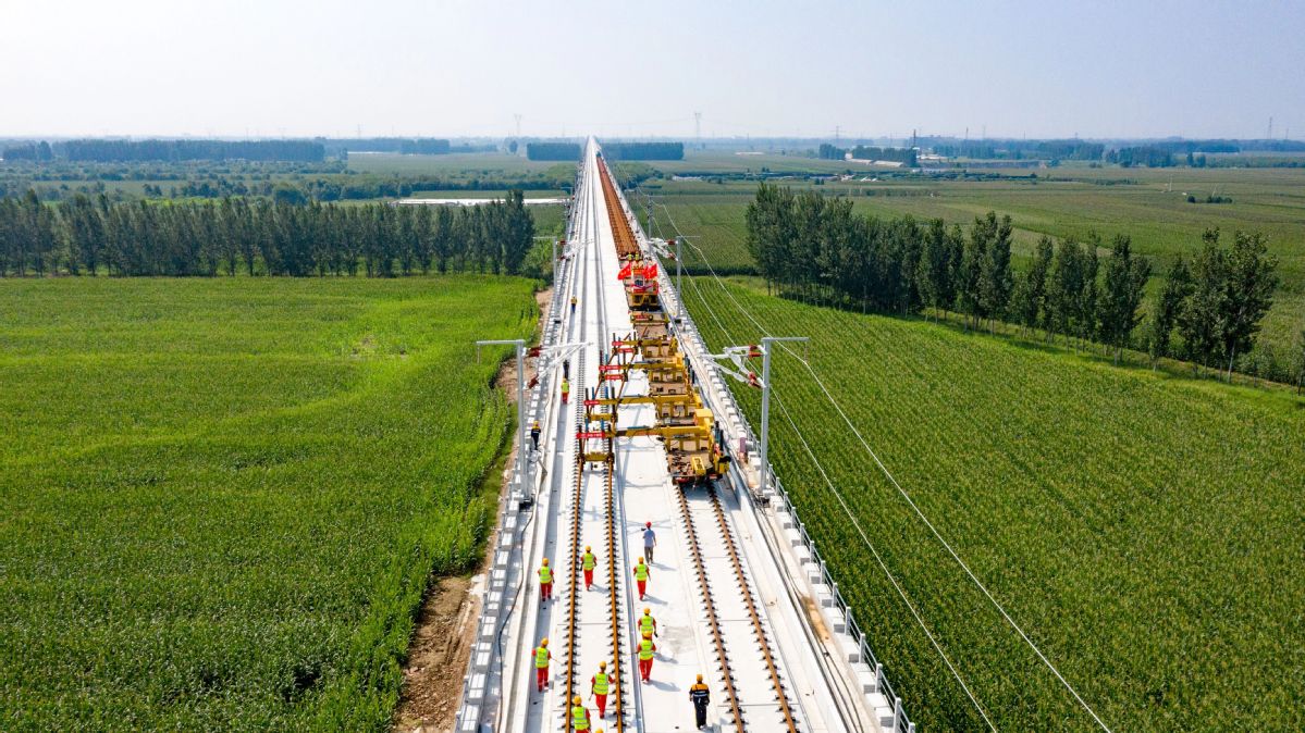 A drone photo taken on Sept 1, 2025 shows workers operating at the track laying construction site of the Xiong'an-Shangqiu high-speed railway in Hejian city, North China's Hebei province. [Photo/Xinhua]