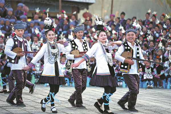 Xiaohuang village in Congjiang county, Guizhou province, hosts a festival to showcase the traditional Grand Song in 2023.