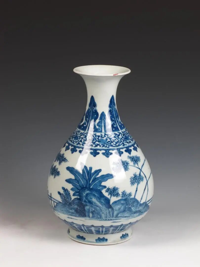 Blue-and-white pear-shaped Yuhuchun vase with bamboo, rock and balustrade motifs, Jingdezhen ware, late Qing Dynasty, from the collection of Zhejiang Provincial Museum [Photo/China National Tea Museum official WeChat account]