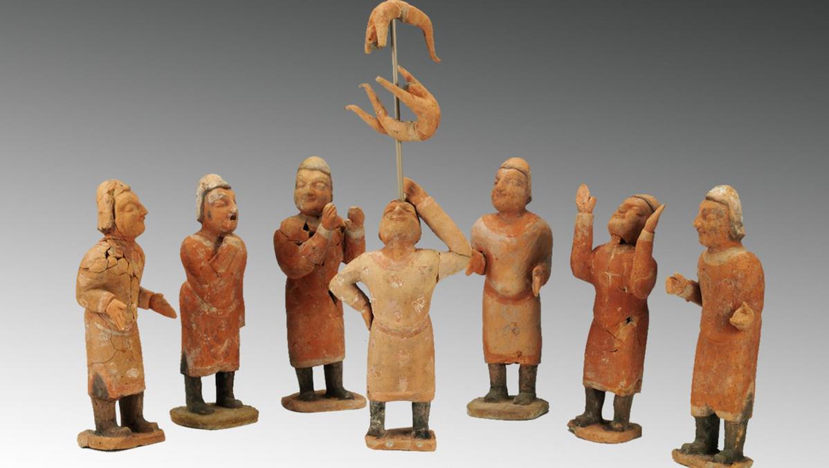 These seven Northern Wei Dynasty (386-534) pottery figurines—all depicting Hu people with deep-set eyes and prominent noses—bring to life a moment of ancient acrobatics.