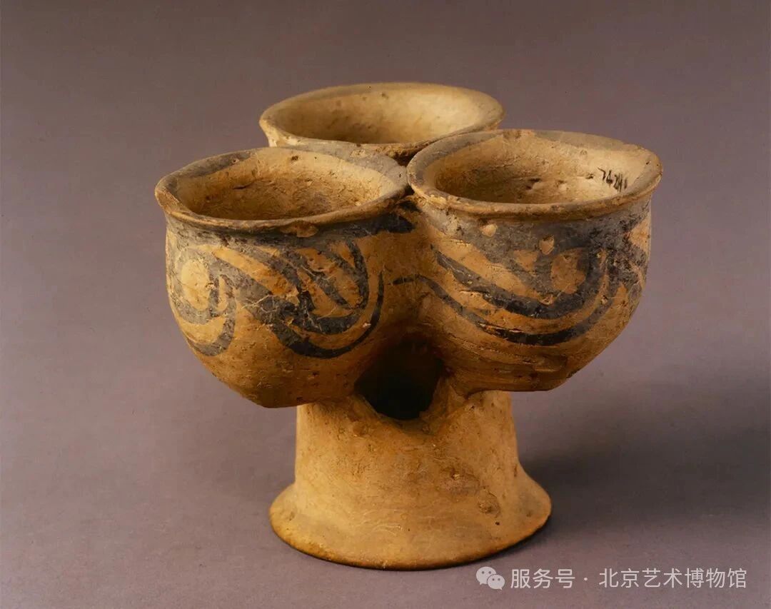 Painted pottery triple cup with spiral motifs, from the collection of Gansu Provincial Museum [Photo/Beijing Art Museum official WeChat account]