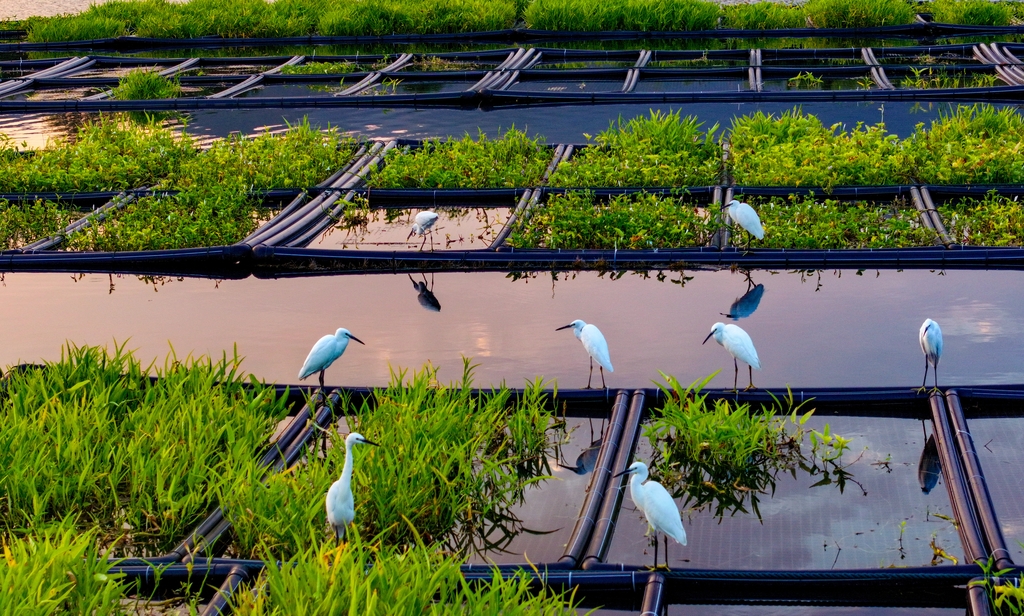 A flock of egrets forage and play on the ecological floating islands of Qiandao (Thousand Islands) Lake in Hangzhou, Zhejiang province. [Photos/IC]
