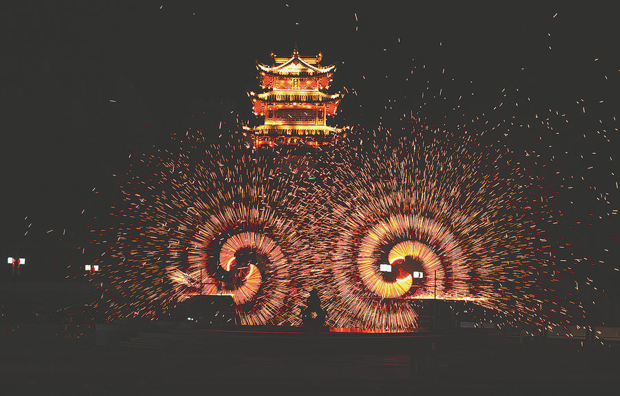 In Huangshan, Anhui province, a performance of dashuhua, or striking iron flowers, dazzles spectators with a brilliant shower of sparks resembling a tree canopy. ZHOU MU/XINHUA