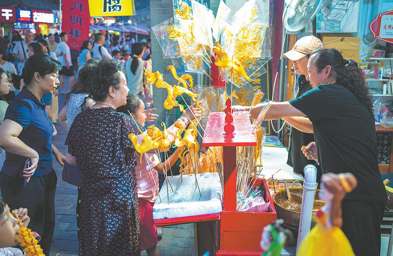 Tourists buy sugar figurines at a night market in Hohhot, Inner Mongolia autonomous region, as the night economy heats up this summer. DING GENHOU/FOR CHINA DAILY