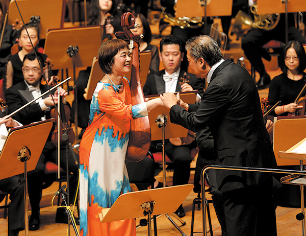 Pipa musician Wu Man interacts with conductor Yu Long during the opening concert of the Shanghai Symphony Orchestra's 2025/26 season. [Photo provided to China Daily]