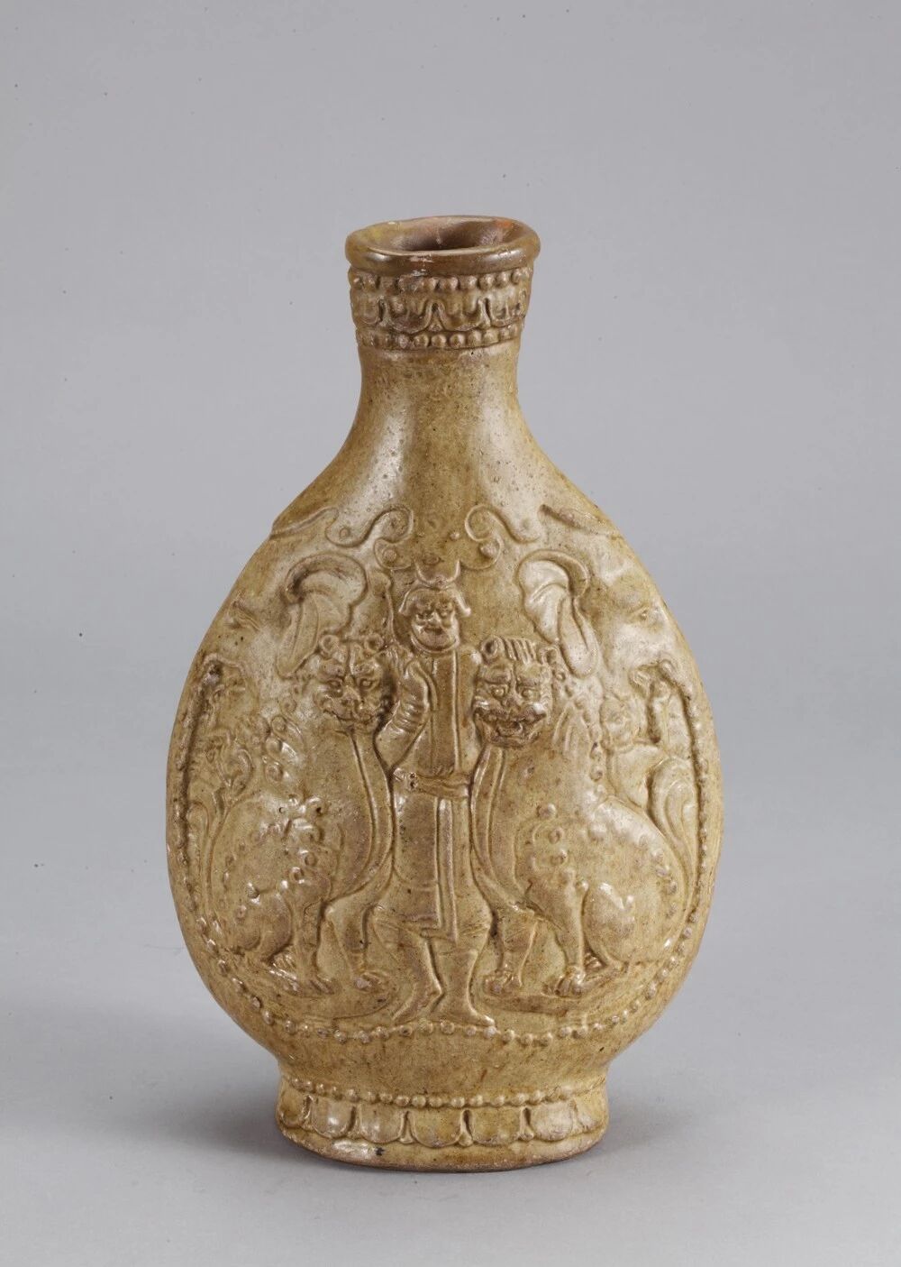 Yellow-glazed mold-impressed flask with "Hu" figure and twin lion design, Northern Qi Dynasty, from the collection of the Shanxi Museum [Photo/Shanxi Museum official WeChat account]