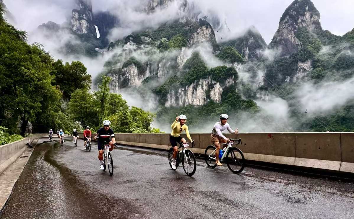 An international crowd of 1,500 riders overcame a test of speed and endurance for a bicycle challenge featuring a 1,000-meter elevation change on a cliffside road in Tianmen Mountain scenic area of Zhangjiajie, Hunan province, on Sunday.
