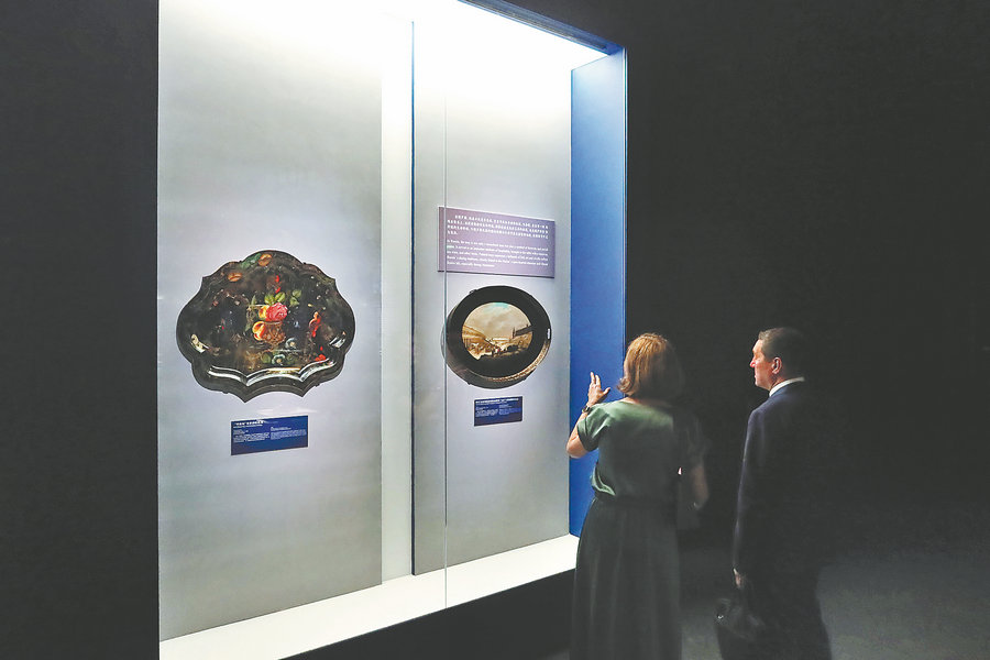 Plates with rich decorative motifs from the State Historical Museum, Russia, on show at the National Museum of China. JIANG DONG/CHINA DAILY