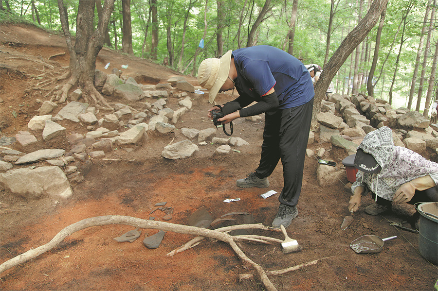 A technician takes photos of the cultural relics unearthed from the site. [Photo provided to China Daily]