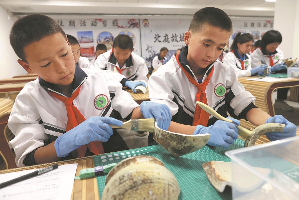 Students experience cultural relics restoration at the Site Museum of Beiting City, Silk Road, in Jimsar county, Xinjiang Uygur autonomous region, on Sept 9. [Photo by Zhu Xingxin/China Daily]