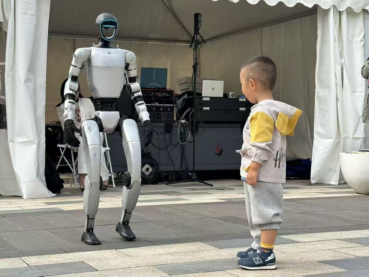 A child watches a smart robot at the exhibition booth. [Photo provided to chinadaily.com.cn]