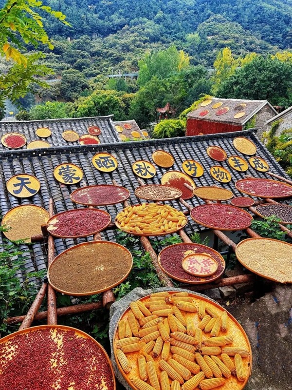 Residents of TianMeng Mountain, Linyi, put corn and other produce under the sun during the autumn harvest. [Photo/WeChat account: sdta12301]