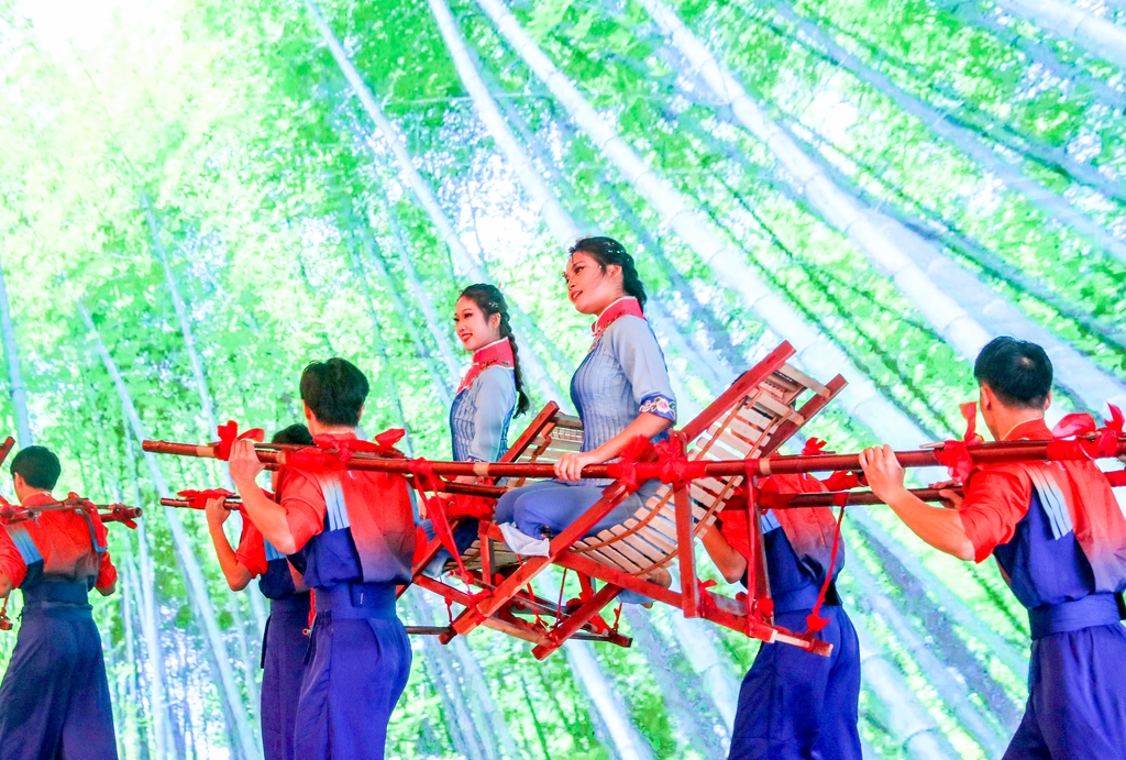 Folk artists present the tradition of Huaying Mountain Sedan Chair Carrying in Guang’an, Sichuan province, on Sept 20. [Photo/IC]