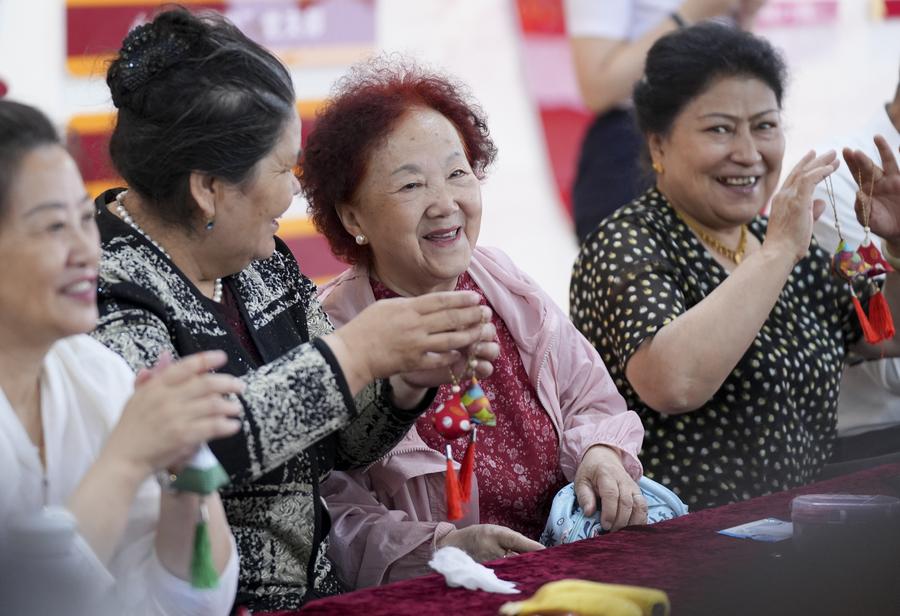 Residents make sachets during a celebration of the Dragon Boat Festival at Guyuanxiang community in Urumqi, Northwest China's Xinjiang Uygur autonomous region, June 6, 2024. [Photo/Xinhua]