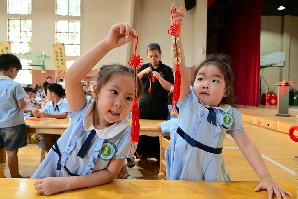 Students experience the Chinese knot making craft. [Photo/IC]