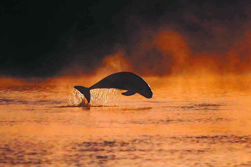 A Yangtze finless porpoise emerges from the water amid the morning mist in Poyang Lake, Jiangxi province, in Feb, 2021. YANG HE/FOR CHINA DAILY