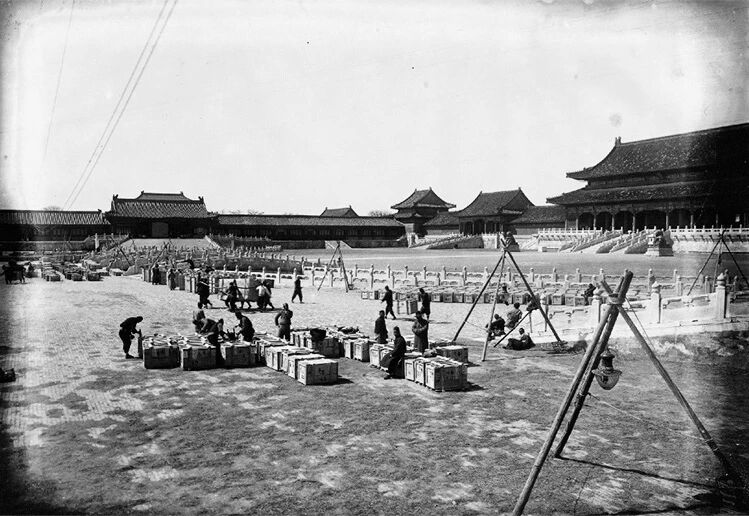 The first batch of treasures for southward evacuation is packed in wooden crates and placed on the square of the Gate of Supreme Harmony (Taihe Men) of the Palace Museum before departure. [Photo/Palace Museum official WeChat account]