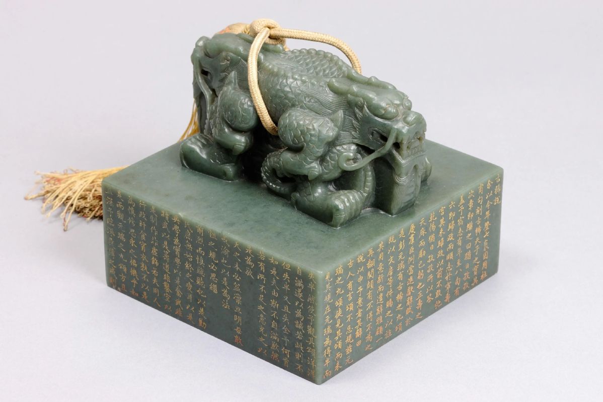 Greenish jade seal with a knob of two intertwining dragons, owned by Emperor Qianlong (r. 1736-95), Qing Dynasty (1644-1911), from the collection of the Palace Museum [Photo/Hebei Museum official WeChat account]