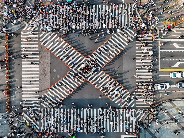 The new layout, proposed by 22-year-old volunteer Li Yicheng from Zhejiang Gongshang University, strengthens control at the corners of the intersection. "In the past, some pedestrians would rush through as the light was about to turn red, creating safety risks," Li explained. "Now, by adding five or six volunteers at each corner to 'close the gate' five seconds before the countdown ends, we can prevent people and vehicles from crossing paths."