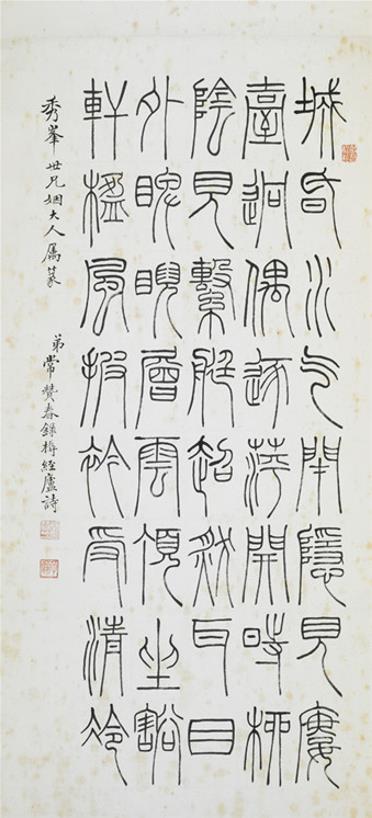 This scroll of calligraphy features a poem by Wang Xuan, whose courtesy name is Jinglu, written in seal script by Chang Zanchun (1872-1941) – a master calligrapher and seal carver of Shanxi in the late Qing Dynasty (1644-1911).