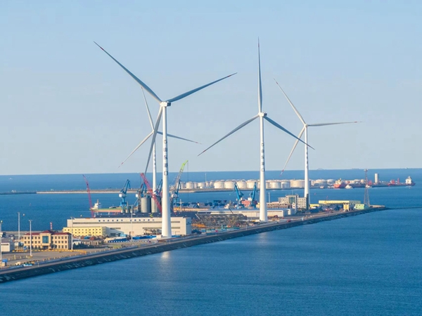 The offshore wind power generation facilities at Shandong's Bohai Bay Port. [Photo provided to chinadaily.com.cn]