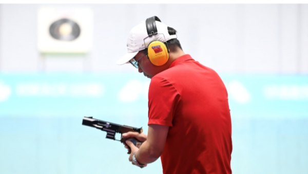Jinan shooter Li Yuehong led Shandong team to victory in the men's 25m rapid fire pistol team event at China's 15th National Games, earning the province its first gold medal in the competition.