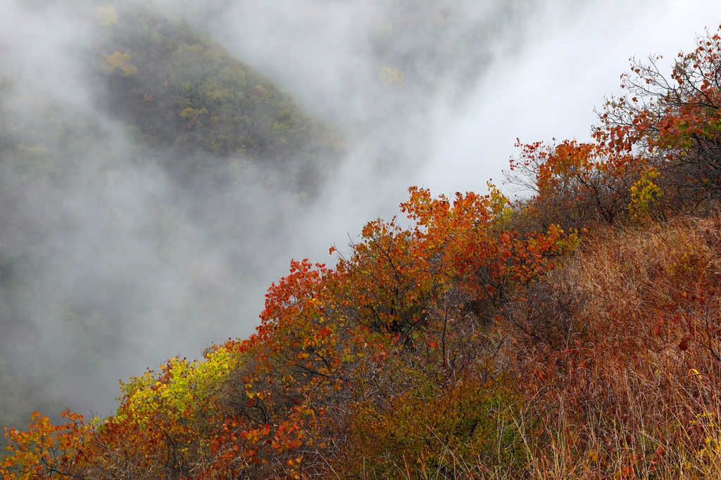 After a rainfall, mist swirled around the mountains of Dahuangmuchang village in Baoshan town, Huairou district, Beijing, creating a picturesque autumn scene.