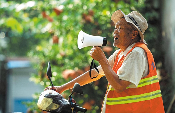 Song Hengchun makes an announcement about the reservoir's water condition to residents of Dongzhaozhuang village in Yiyuan county, Shandong province, on Aug 11. ZHAO DONGSHAN/CHEN MING/FOR CHINA DAILY