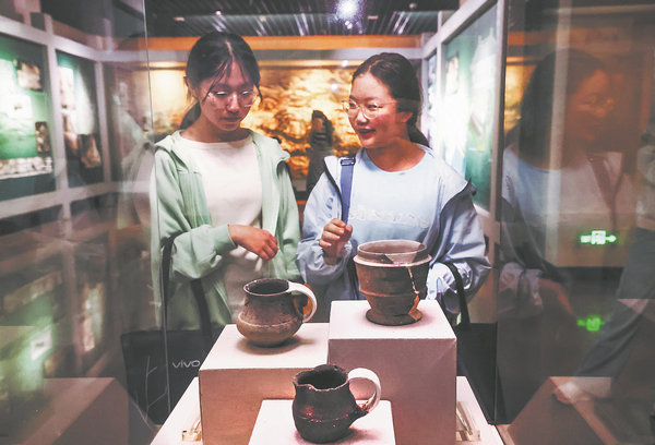 Two visitors appreciate the exhibits at a museum in Lianyungang, Jiangsu province, on Oct 4 during the weeklong holiday. [Photo/WANG JIANMIN/XINHUA]