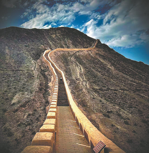 The Overhanging Great Wall in Jiayuguan is a narrow bulwark that snakes up the slope of a mountainside. [Photo by ERIK NILSSON/CHINA DAILY]